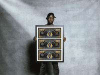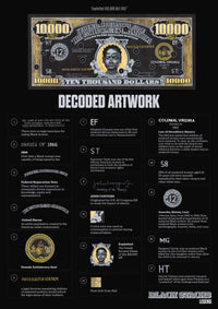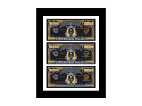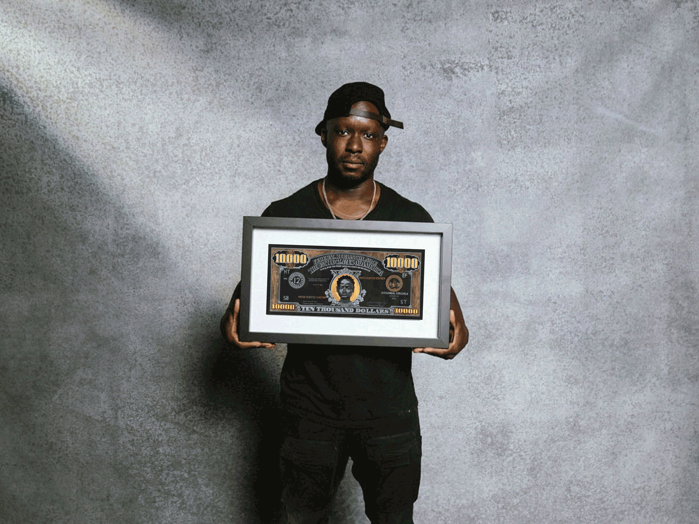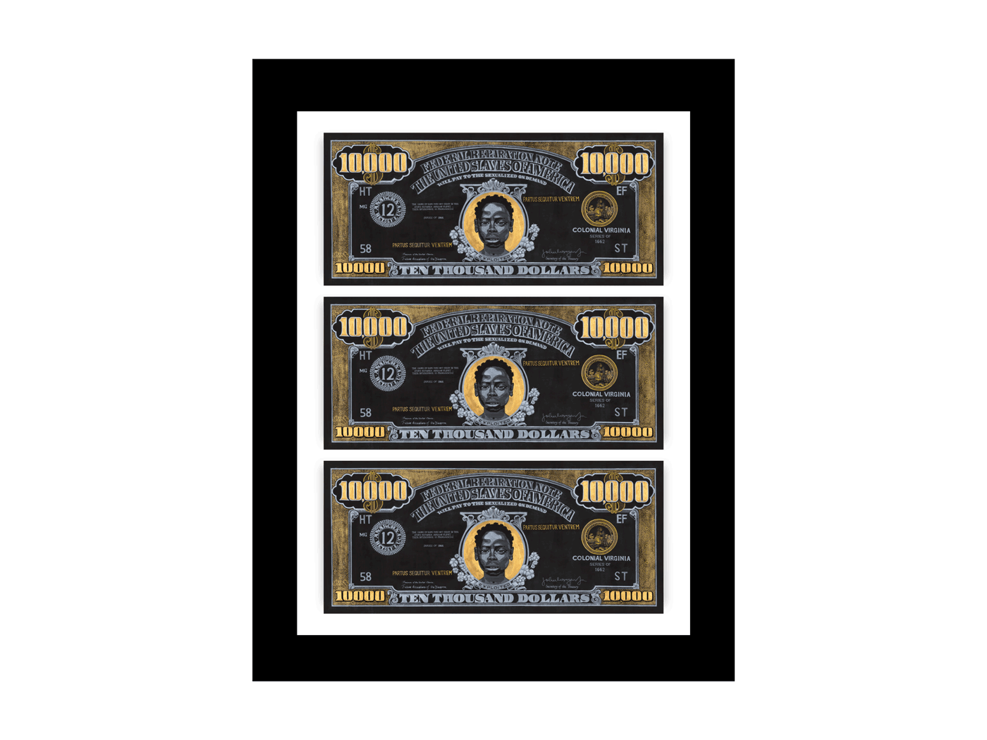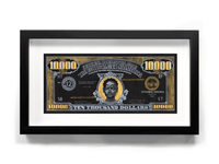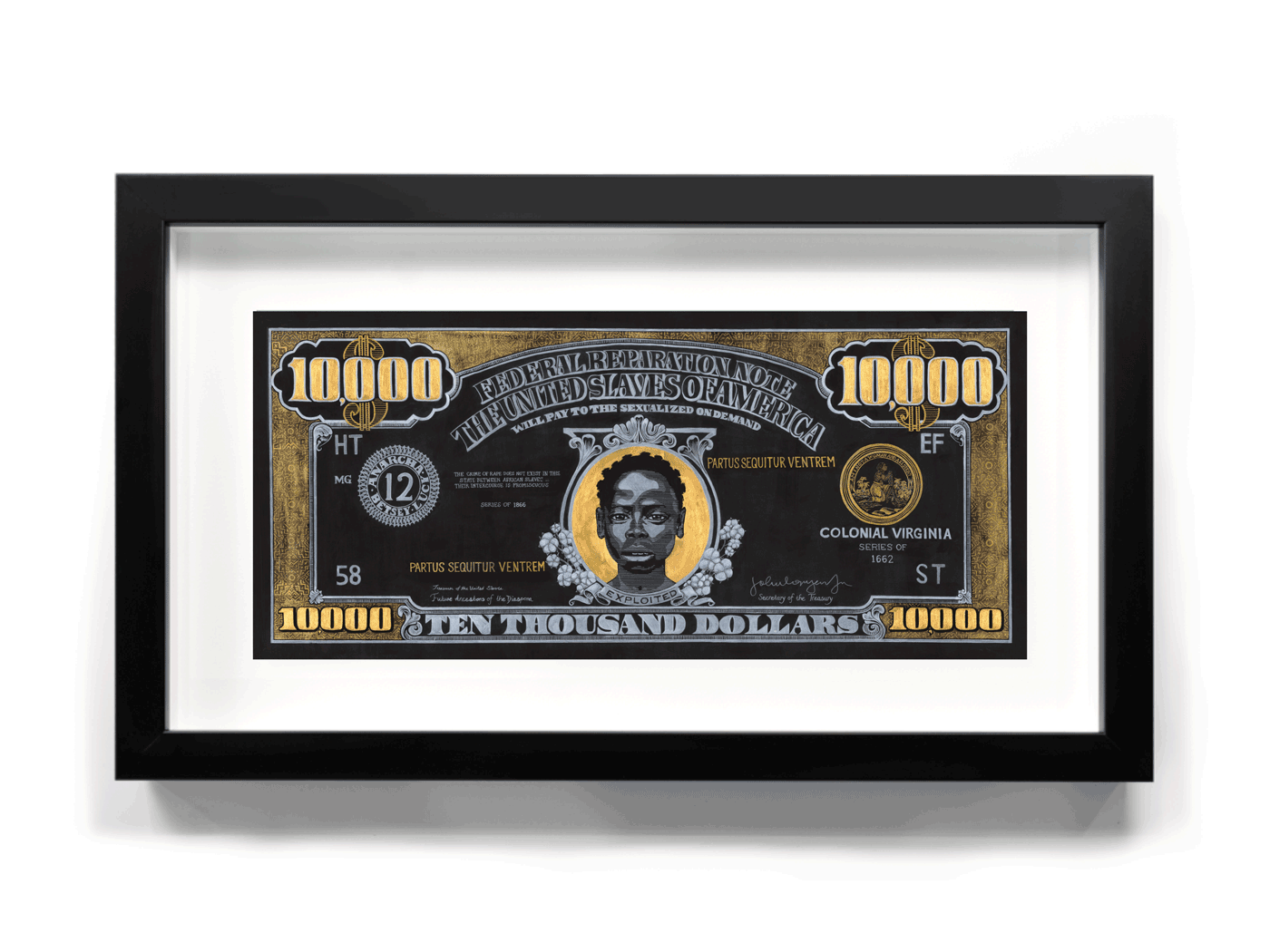 This thought provoking artwork from Andre Woolery's "Black Stacks" collection presents a meticulously crafted $10,000 bill reimagined as social commentary, elegantly displayed in a sophisticated black frame.