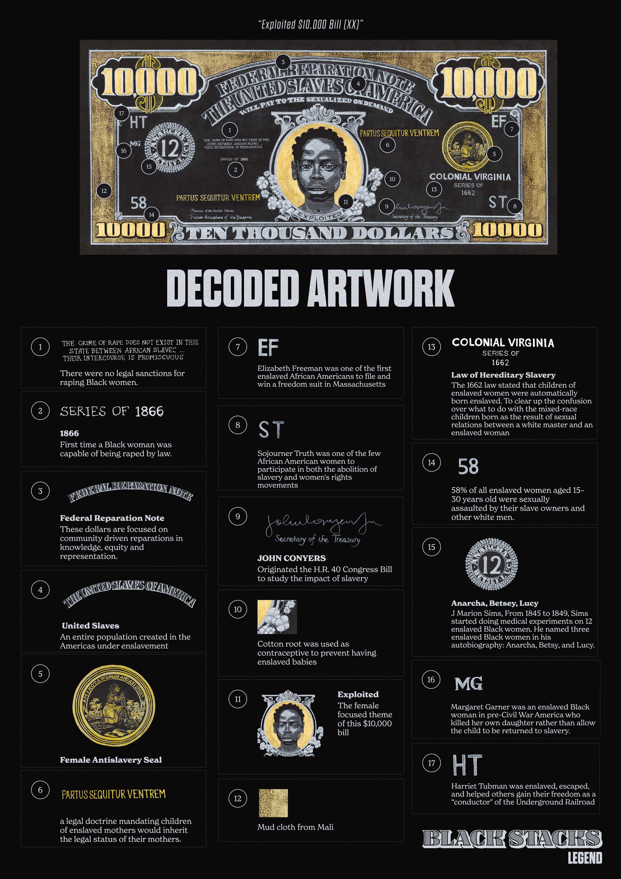 Woolery's attention to historical context is evident throughout the composition. The Latin phrase "Partus Sequitur Ventrem" (the offspring follows the womb) appears prominently—referencing the 1662 Virginia law that determined enslaved status would follow the mother. Every detail creating a powerful statement about the painful exploitation of Black women throughout American history.