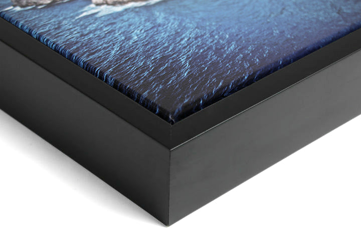 Pre-installed hanging hardware with rubber bumpers that protects wall surface and keeps print straight on the wall. Side panels of gallery wrap are black.